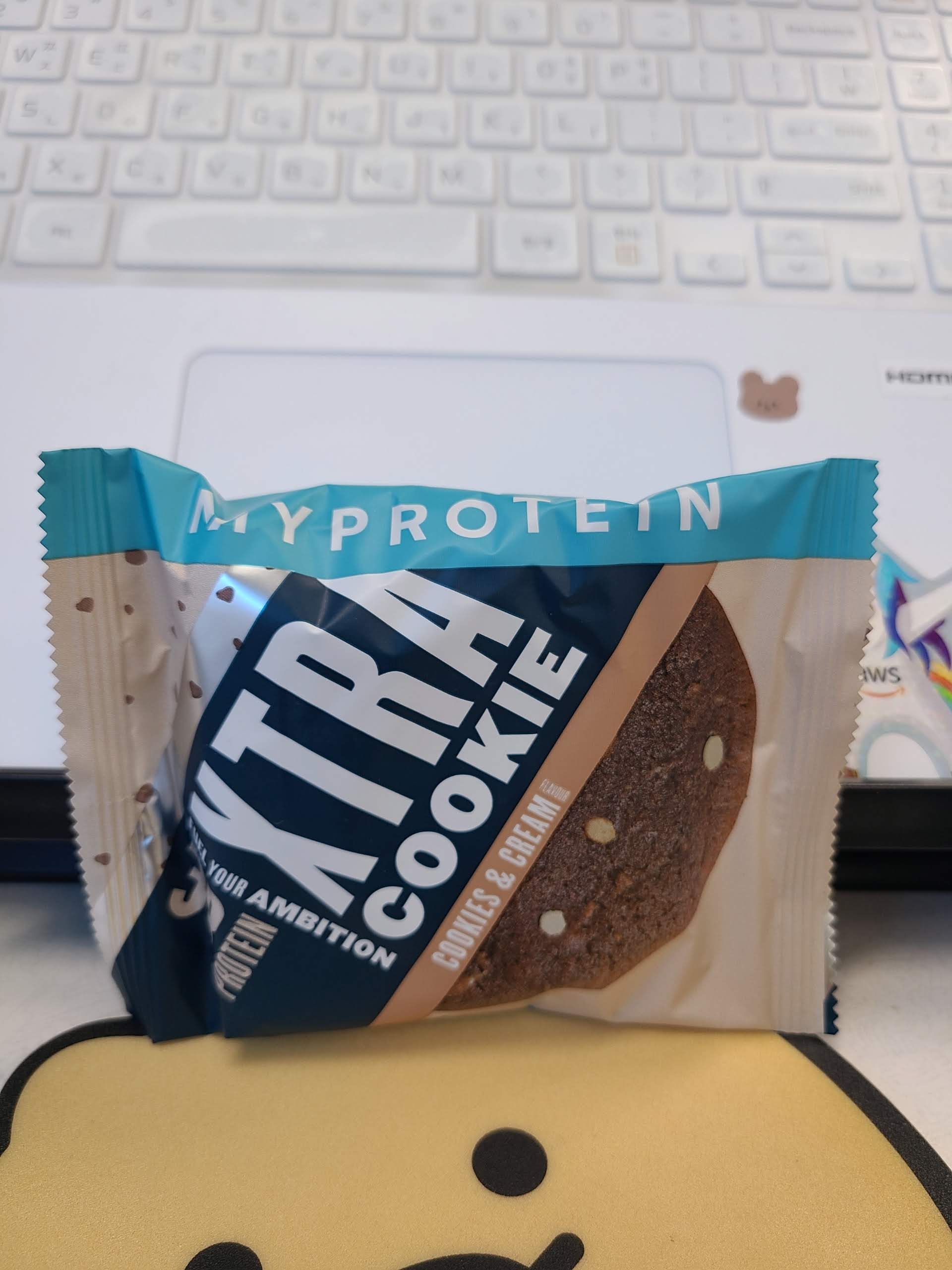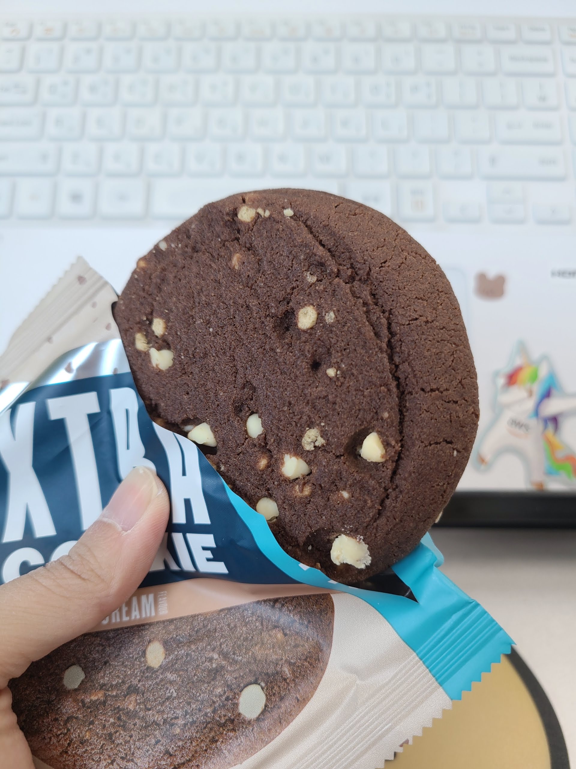 나는 단백질 간식을 좋아하지는 않는거 같다.. 아예 다이어트가 목적인 사람들이라면 간식을 제한하니 이걸 대신 먹는게 맛있는거 같은데..나는 살을 빼는게 목적이 아니기 때문에 그냥 진짜 맛있는 쿠키를 먹고싶어 진다. 아무래도 단백질 간식이라는 맛은 좀 느껴지는 편. 아무튼 쿠키 크기가 은근히 커서 포만감이 꽤 느껴지고, 흰 부분은 생각 외로 별맛 안난다. 근데 중간중간 크런치같은게 씹힘.